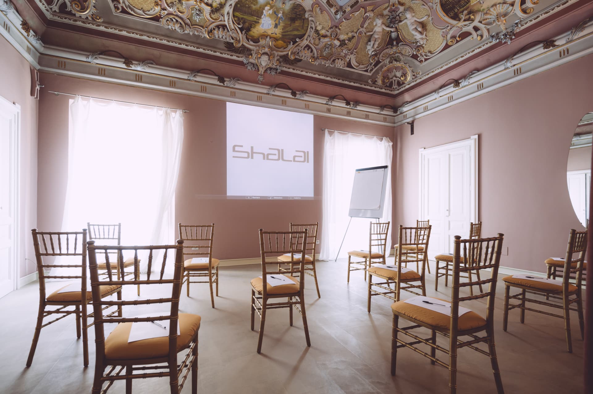 Più comunemente noto come Salone delle Feste è lo spazio centrale, al primo piano di Shalai, che subito vi darà il benvenuto alla sommità della scalinata. I soffitti affrescati con opere originali dell’800, conferiscono al salone un’accuratezza sui generis legata all’accoglienza. Il salone si presta per piccoli eventi privati, per organizzare meeting di lavoro con la disposizione di un tavolo presidenziale e sedie a platea, piuttosto che sistemare i tavoli a ferro di cavallo o in assetto rettangolare, tutto dipende dal tenore dell’incontro, dal livello professionale da conferire allo stesso e dalla possibilità di interloquire facilmente. In ogni caso, è veramente elegante poter disporre del Salone delle Feste per organizzare i vostri meeting siano di lavoro o di altro, in quanto il salone si presta a tantissimi utilizzi, anche con possibilità di proiettare a muro slide e poter prender visione di materiale multimediale. Potrete svolgere il vostro incontro in assoluta serenità, senza rumori che possono giungere dall’esterno o dalle altre stanze attigue, in quanto tutto rigorosamente intimo e non di passaggio.